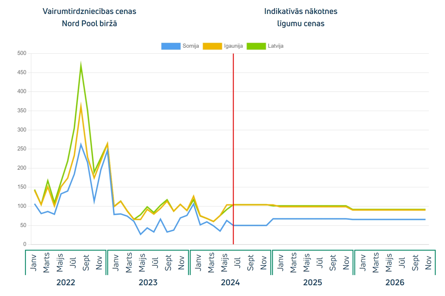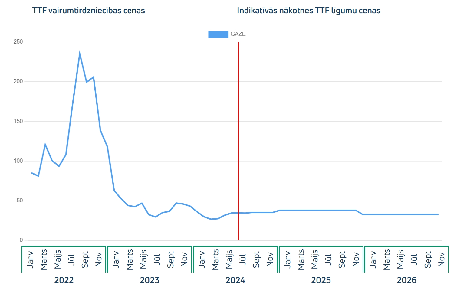 - Indikatīvā TTF nākotnes līguma cena 2024\. gada augustam ir 34,40 EUR/MWh, 2024\. gadam 35,30 EUR/MWh, 2025\. gadam 38,00 EUR/MWh un 2026\. gadam 32,75 EUR/MWh. Indikatīvā TTF nākotnes līgumu cena atspoguļo šī brīža prognozes nākotnes cenām.