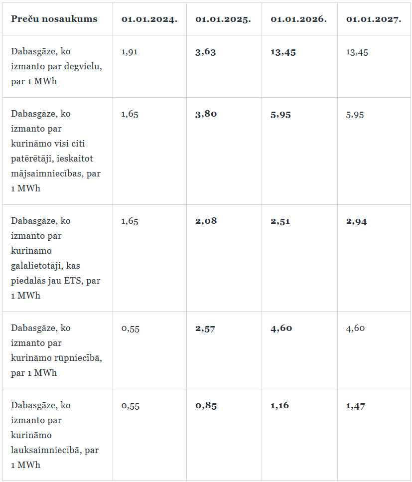- Dabasgāzes izmantošanai par kurināmo rūpnieciskās ražošanas un citos ar ražošanu saistītos procesos un tehnoloģiski nepieciešamā klimata nodrošināšanai rūpnieciskās ražošanas telpās pieaugs no 0,55 eiro par MWh līdz 2,57 eiro.