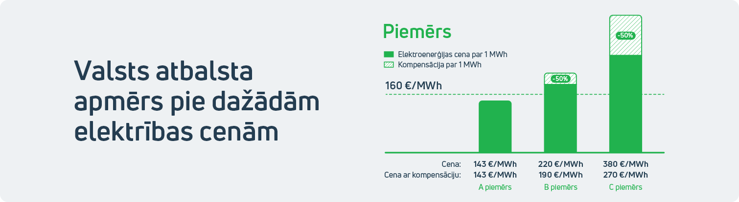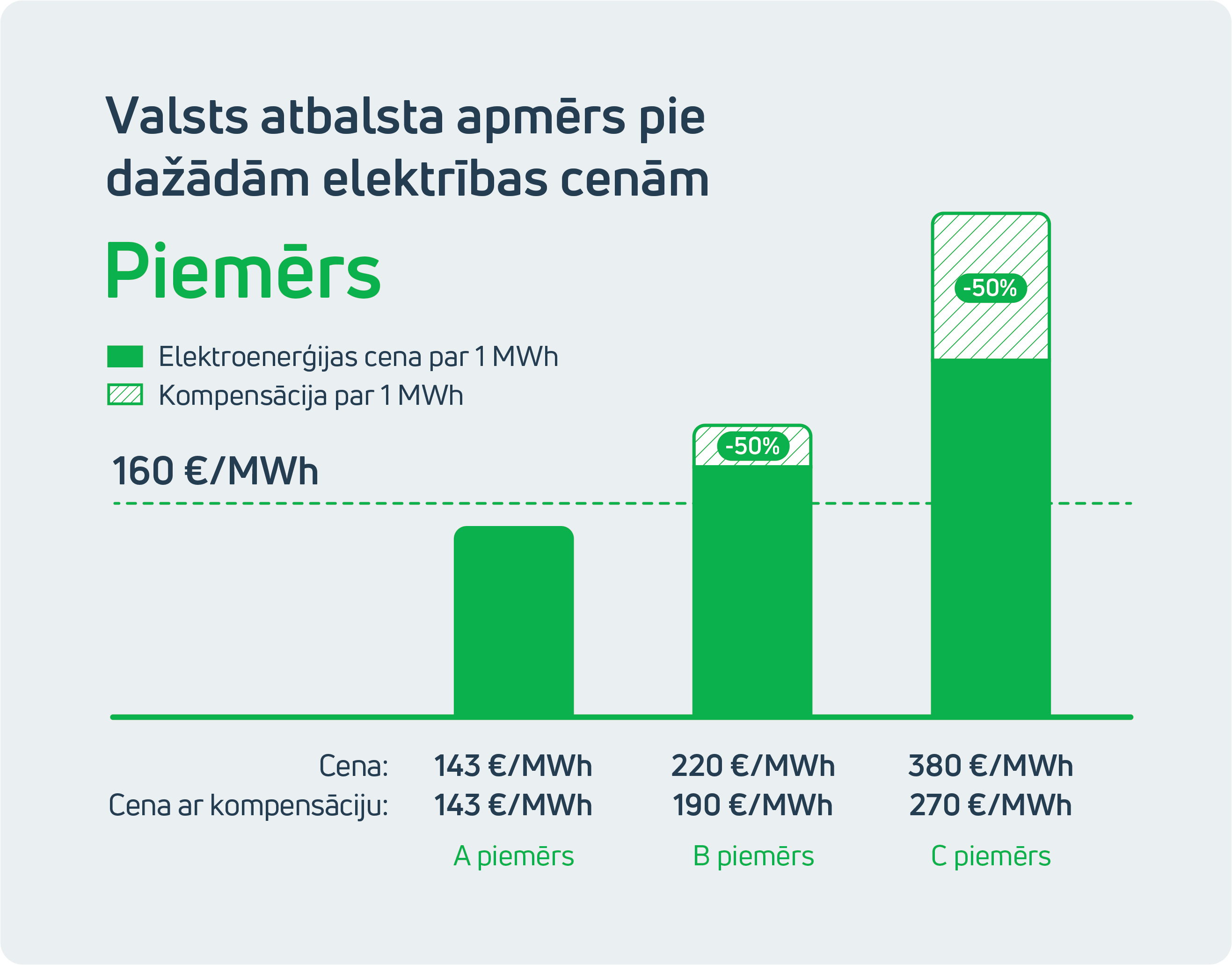- Uz **laiku kompensēti 50% elektroenerģijas cenas virs 160 EUR/MWh**.